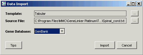 4. GeneLinker™ uses a template to interpret or parse the data values as they are read in from the data file. The installed default for the template is Tabular. If the Template listed on the Data Import dialog is NOT Tabular, click the Template Change button. This displays the Import Templates dialog. Click Tabular and click Select. The Data Import dialog is updated showing Tabular as the template.