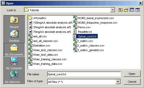 6. Navigate to the GeneLinker™ Tutorial folder (if necessary) and click the file Spinal_cord.txt. The file is highlighted.